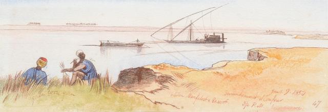 Pencil, pen and brown ink and watercolour. Inscribed, dated and numbered ‘Jany.9.1854/Benimhammed el Confour/between Manfaloot & Es-sioot./3/2PM / 47’ (lower right), colour notes throughout. 8 x 23cm (3 x 9 in.)