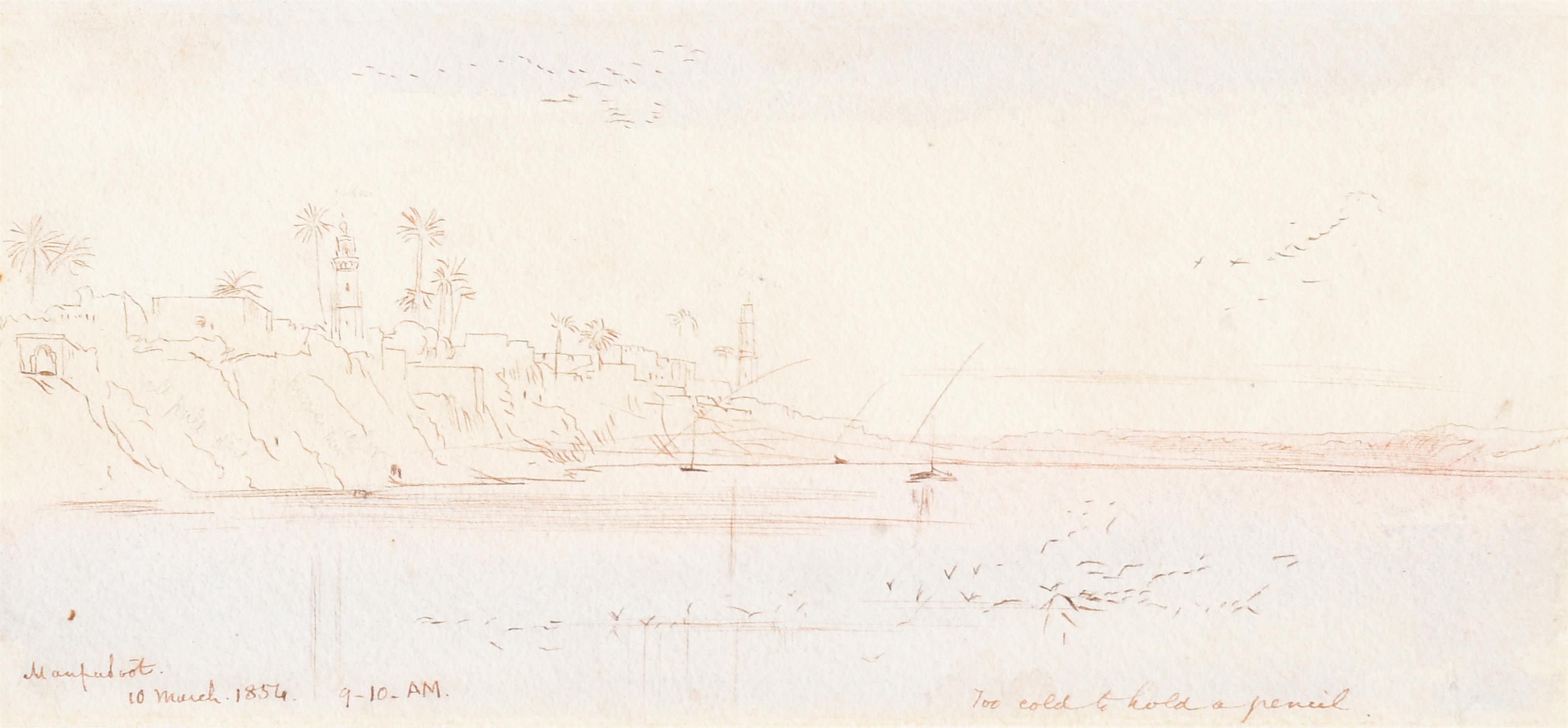 Pen, ink and wash. Inscribed and dated ‘Manfalut,10 March 1854, 9-10AM’ (lower left) and further inscribed ‘Too cold to hold a pencil’ (lower right). 10.5 x 22cm (4 x 8½ in.)