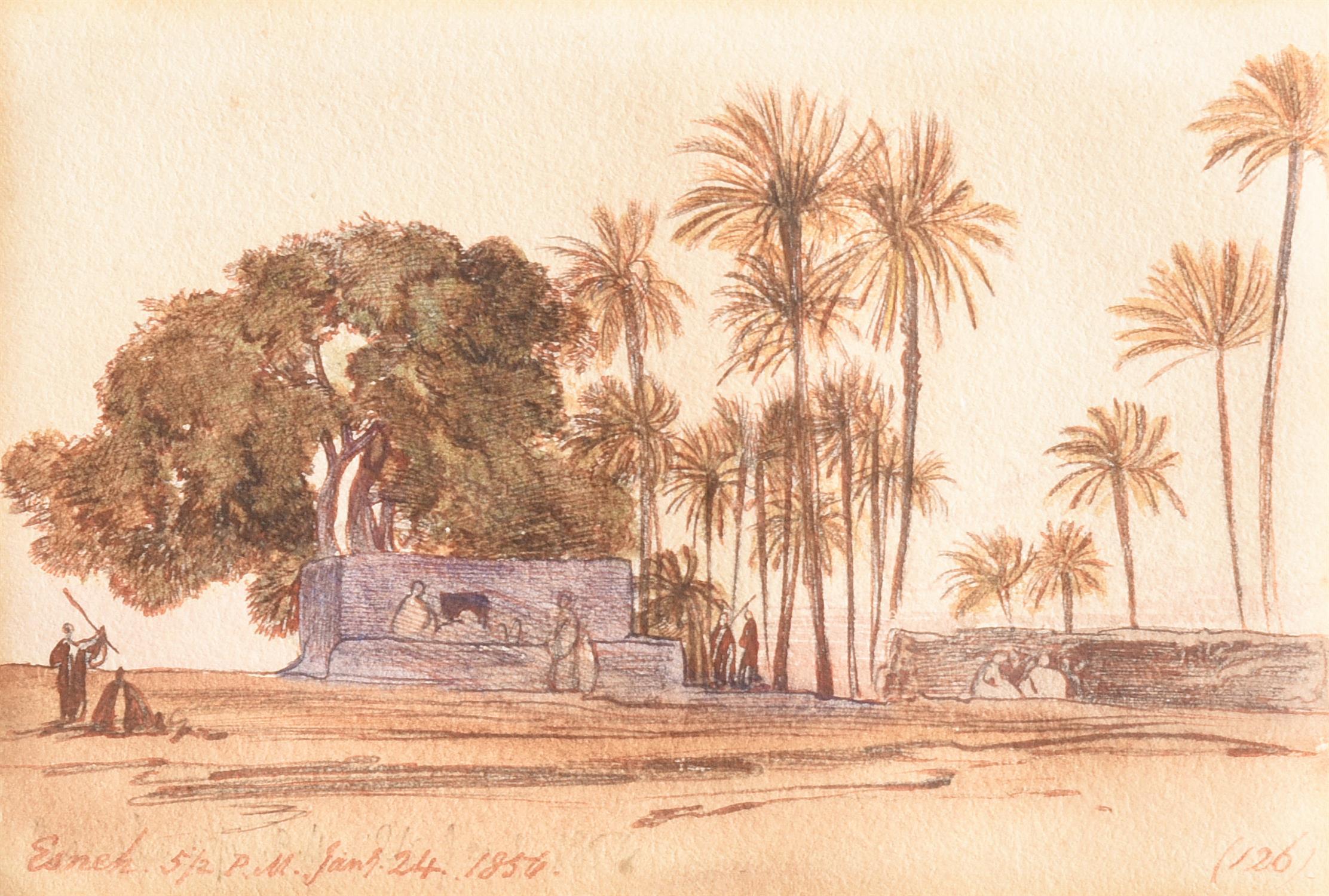 Pencil, pen and red ink and watercolour on buff paper. Inscribed and indistinctly dated ‘Esneh.5/2 P.M. Jany24.1856(?)’ (lower left) and numbered ‘(126)’ (lower right). 10 x 15.5cm (3¾ x 6 in.)