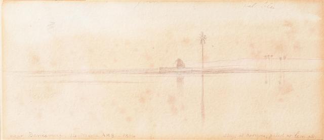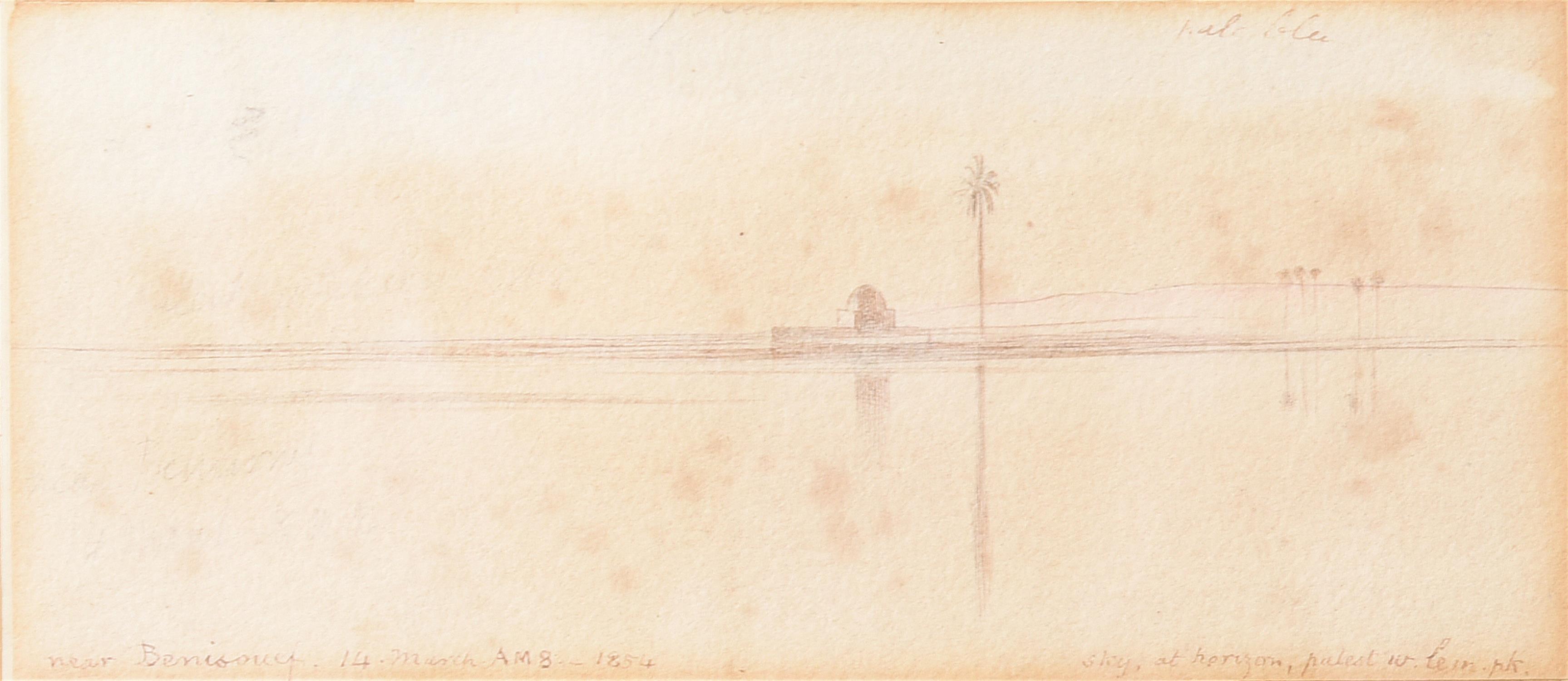 Pen, ink and wash. Inscribed ‘near Benisouef. 14. March. AM 8-1854’ (lower left) and ‘Sky, at horizon, palest water pk(?)’ (lower right), and with colour notes throughout. 6.5 x 15cm (2½ x 5¾ in.)