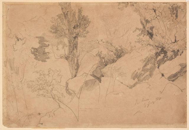 Pencil on grey-brown paper, laid onto card, title and date ‘9 July 1840’ to lower right in pencil, pencil note to lower left ‘Ivy’, small loss at left lower corner, slight overall toning, sheet size 27.2 x 40 cm (10 6/8 x 15 3/4 ins), framed and glazed (45 x 56 cm).