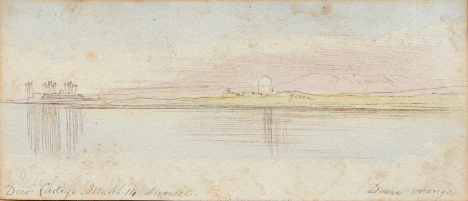 Inscribed Deir Cadige March 14 sunset Dome orange, 66 x 151mm. Loosely laid down on an old mount, slight sporadic stains, undisturbed in old ebonised frame with, on the reverse, the trade label of H Isaacs Burton on Trent.