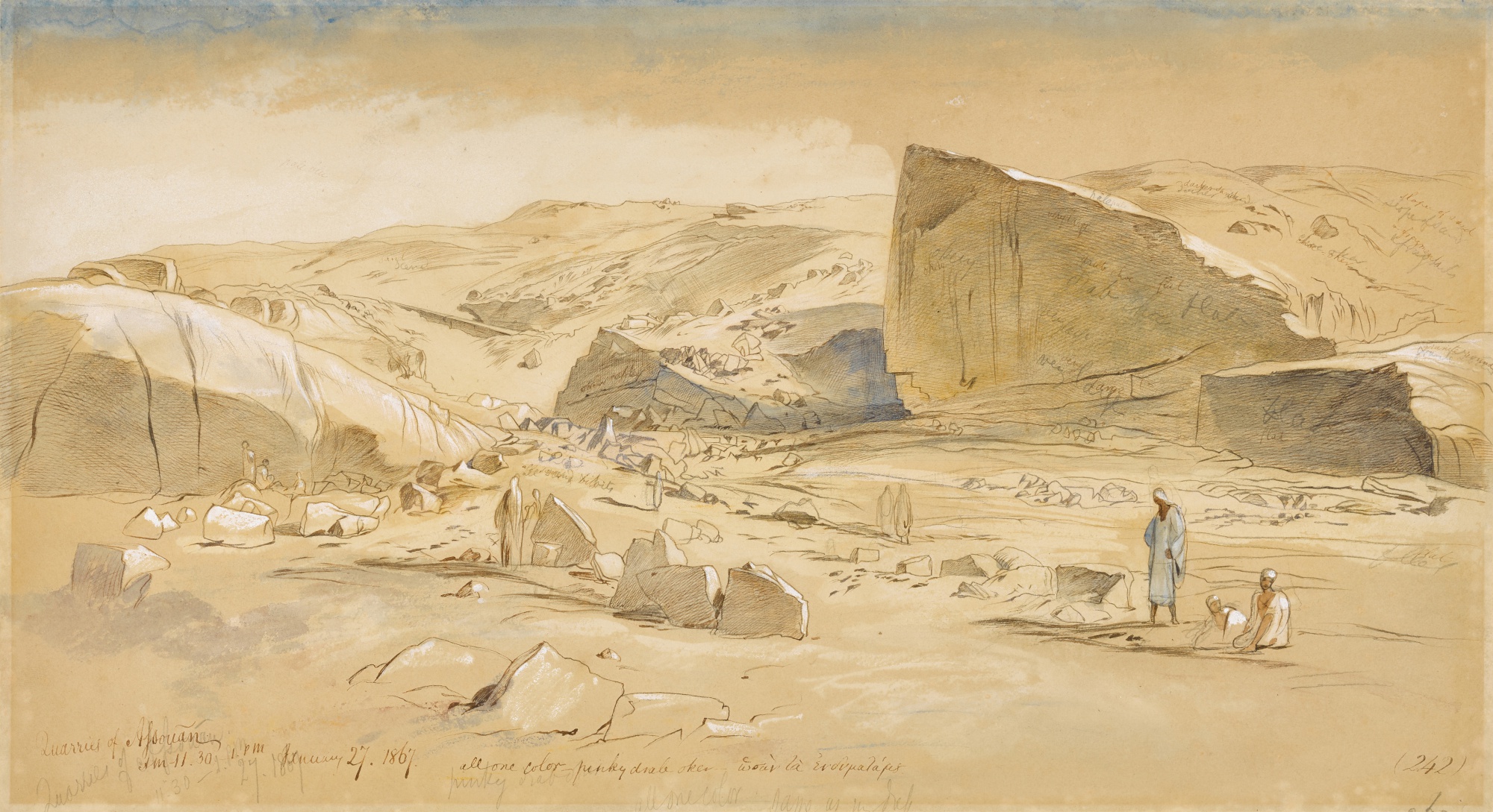 Inscribed Quarries of Assouan / Am-11.30 1. pm / February 27. 1867. lower left; further inscribed with extensive artists colour notes. Pen and brown ink over pencil, heightened with watercolour and bodycolour. Unframed: 28.9 by 53cm., 11¾ by 20¾in. Framed: 54.7 by 77.5cm., 21½ by 30½in.