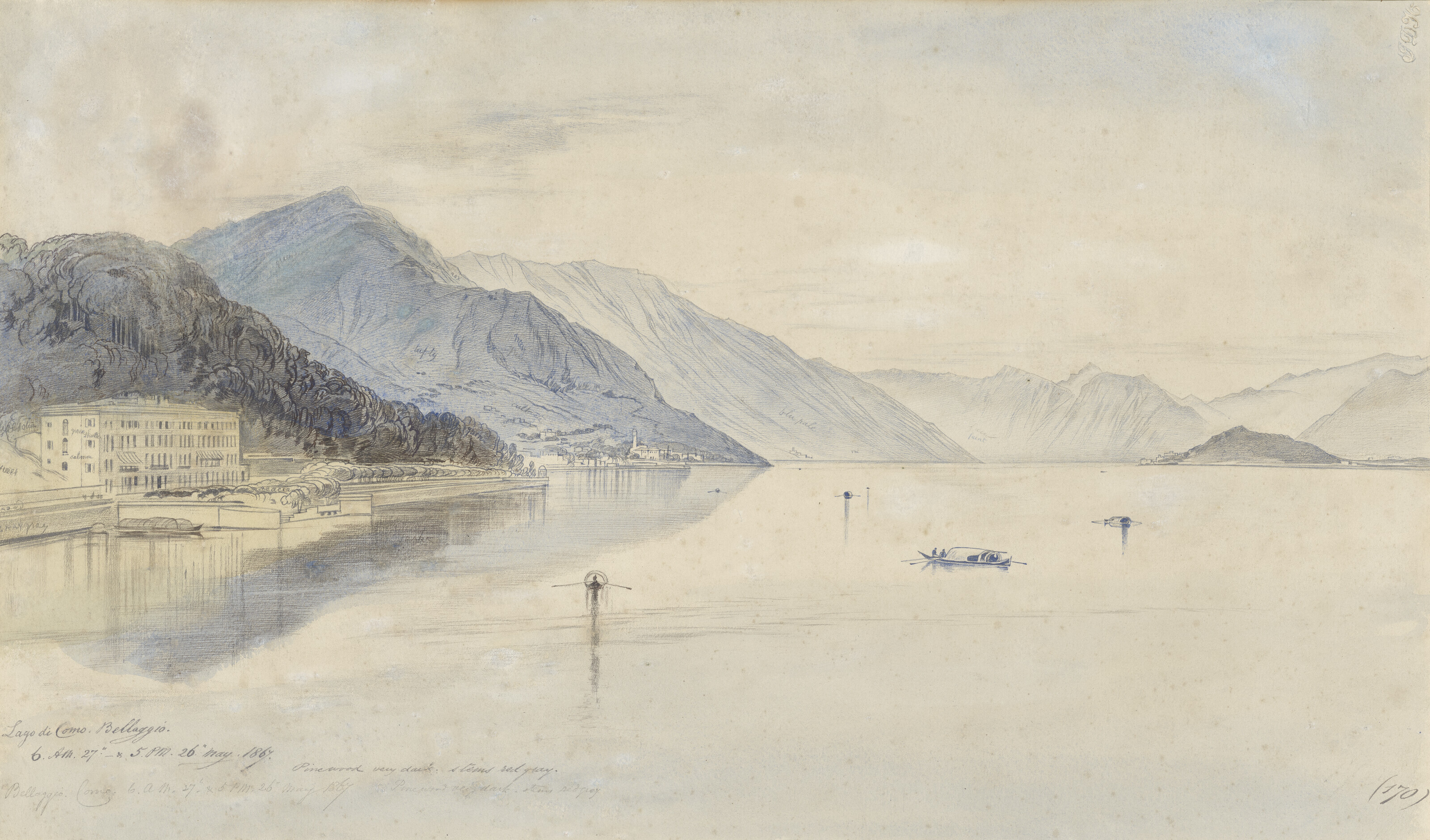Inscribed and dated ‘Lago di Como. Bellagio./ 6.AM. 27th. & 5.PM. 26th May. 1867./ Pinewood very dark. Stems red gray.’ (lower left) and numbered ‘(170)’ (lower right) and further inscribed throughout with colour notes. Pencil, pen and grey ink, grey and blue wash on paper. 13 x 22 in. (33 x 55.9 cm.)