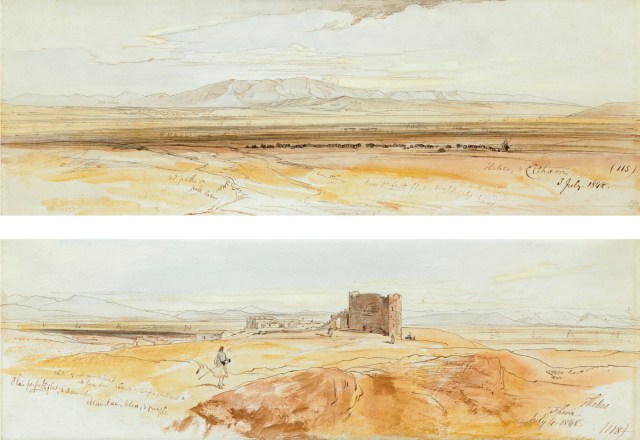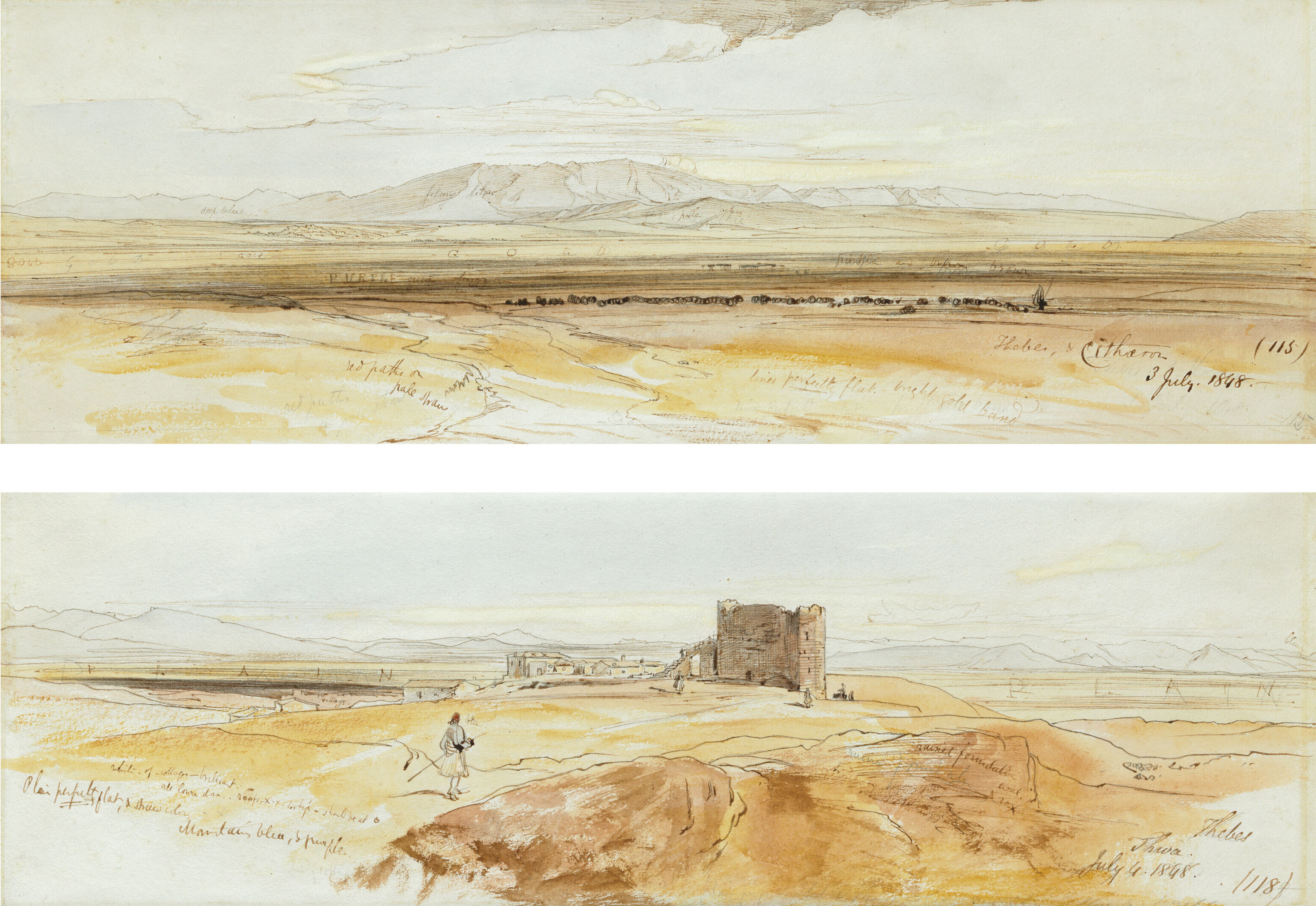 The first inscribed and dated ‘Thebes & Cithaeron / 3. July. 1848 / (115)’ (lower right), and inscribed with artist’s notes throughout; the second inscribed and dated ‘Thebes / Thiva. / July 4. 1848. (118)’ (lower right), and inscribed with artist’s notes throughout. Pencil, pen and brown ink and watercolour on paper. 6 7⁄8 x 20 in. (17.5 x 50.8 cm.); 6 5⁄8 x 20 in. (16.8 x 50.8 cm.)