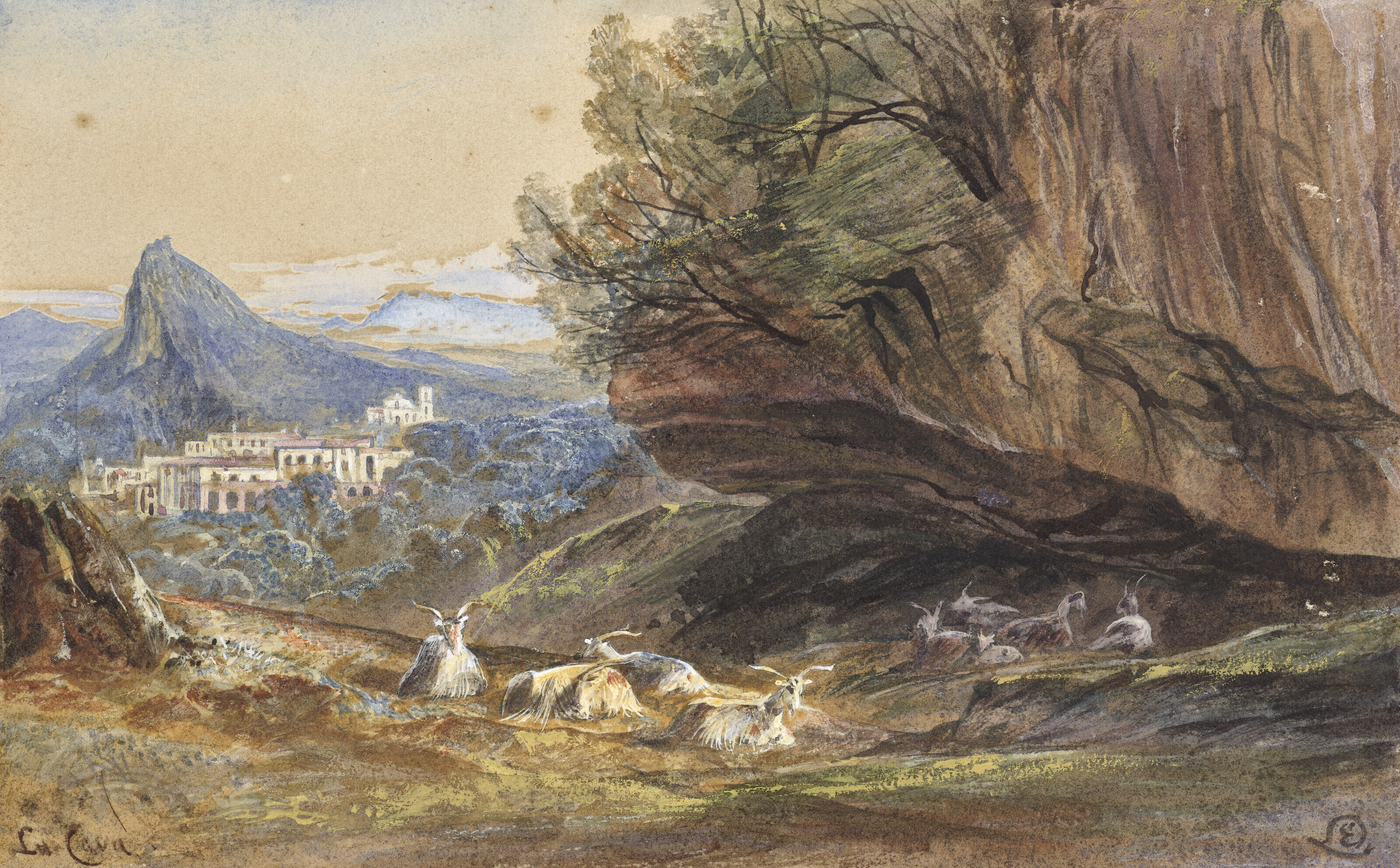 The highly finished nature and tight monogram of this watercolour identify it as a studio work, rather than an on-the-spot drawing. A pencil drawing of La Cava, dated 20 July 1838, is at the Yale Center for British Art.