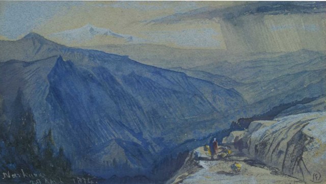 Watercolour study heightened in white – ‘Narkundo’, 29th April 1874, monogrammed lower right, 10cm x 17.5cm, mounted and framed under glass.