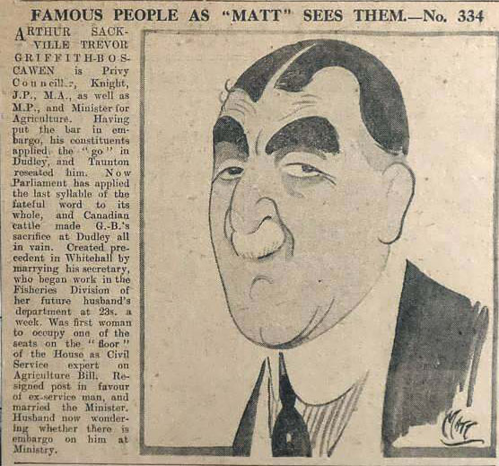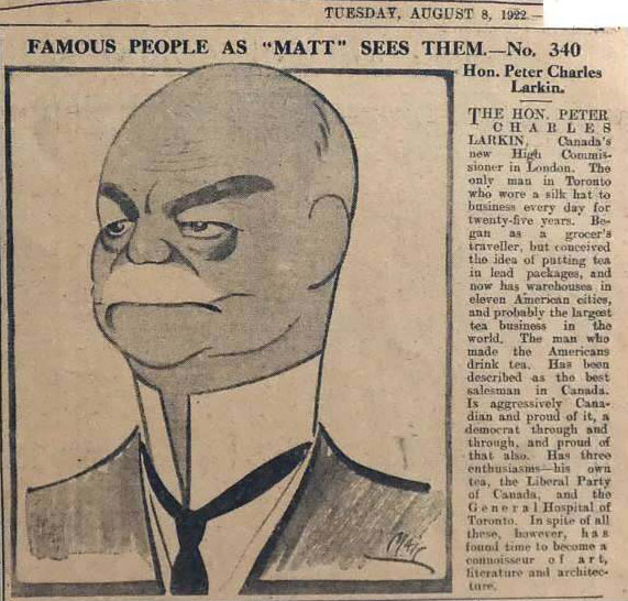 This would be the Irish Matt Sandfort (1877-1943), who in 1922 published Sixty Daily Sketch Cartoons of Famous People as “Matt” Sees Them. Is the above cartoon in the book? Can anyone check? Or has a suggestion as to whose caricature this was?