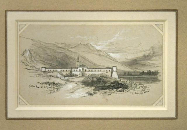 Signed lower right ‘E. Lear del. 1844’ and inscribed lower left ‘Abbadia di S. Spirito.’ Black chalk, pencil and stump heightened with white on buff paper 8.5 x 15cm