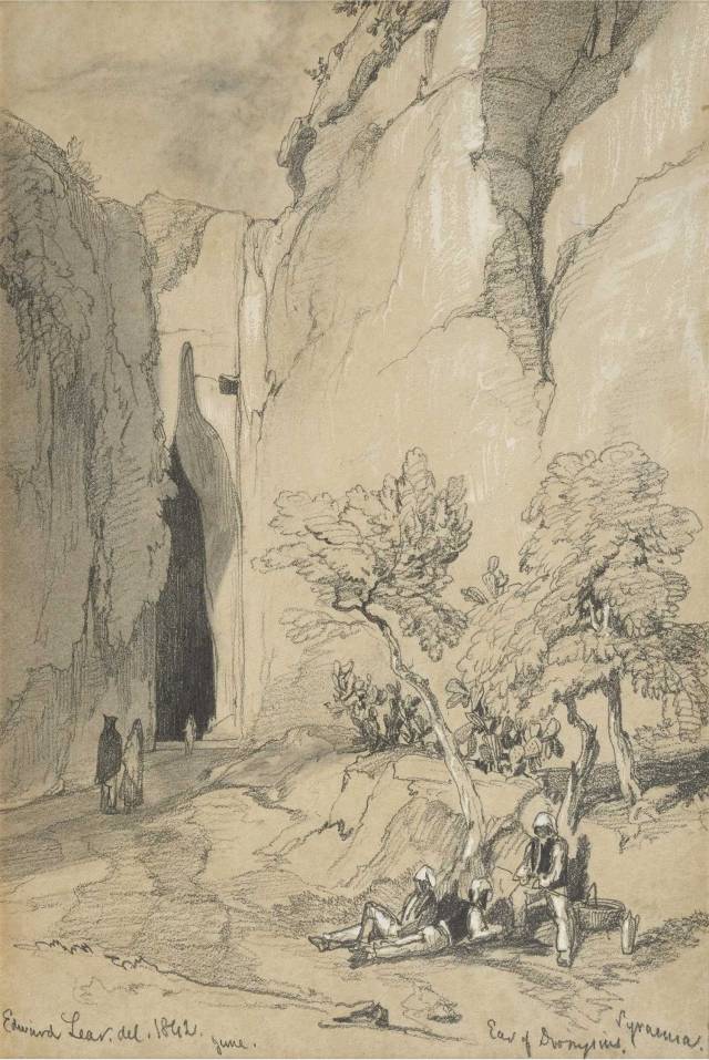 Black chalk heightened with white on grey paper, 230×310 mm. On the recto, lower left, black chalk: “Edward Lear. del. 1842. June”; lower right, black chalk: “Ear of Dionysus. Syracusa”
