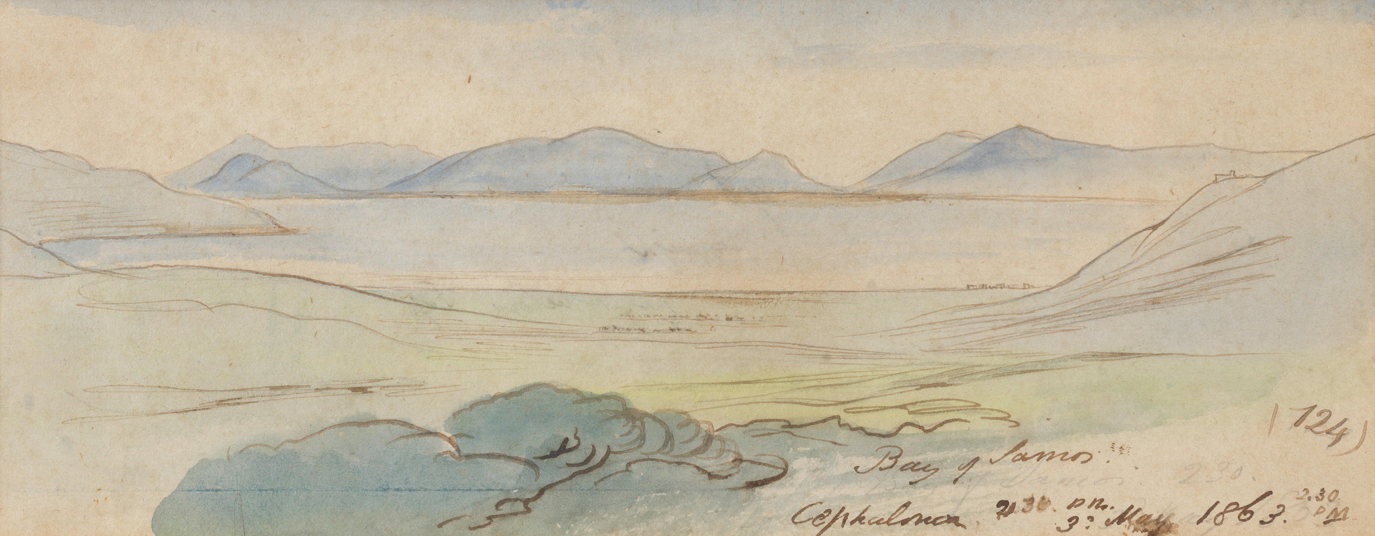 Inscribed and dated ‘Bay of Samos/Cephalonia 2:30pm/3rd May 1863. 2.30pm/124’ (lower right). Watercolour and ink over traces of pencil. 11 x 27cm (4 5/16 x 10 5/8in).