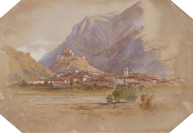 For 14th and 15th of August 1843 Lear notes ‘these two days I spent in sketching the town, and the pass up to the picturesque Madonna delle Grotte. The only chance for drawing is by rising before the sun, and making use of every moment of time until the heat (which in this valley is very great) obliges one to return to shelter. After the mid-day meal, which was a cheerful one enough, at the Casa Todeschini, sleep and music divided the hours until it was time to recommence drawing. The stillness of an Italian town during this period of the day is striking. Three or four children are playing with a tame sheep under my window, making a hundred pretty groups and pictures; the two widows are humming faintly to the guitar; all the rest of Antrodoco seems fast asleep. The magnificence of the pass just above the town towards evening is extreme: except in the creations of Titian or Giorgione, one seldom sees such hues of purple and blue and gold as those with which those lofty hills are clothed with in an Italian sunset.’ (Edward Lear, Illustrated Excursions in Italy, 1846, p. 58)