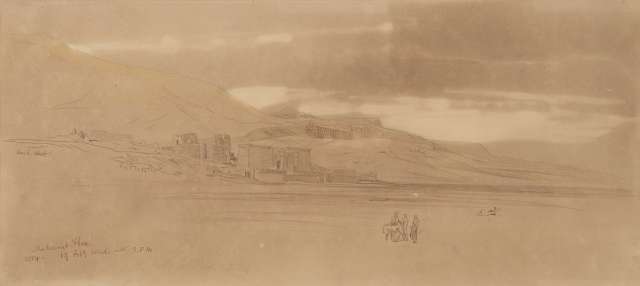 The present watercolour depicts the great 20th dynasty mortuary temple of Rameses III (c. 1182-1150 BC) and adjoining temples at Medinet Habu on the west bank of the Nile at Thebes (Luxor). To the right, behind the hills in the distance, lies the Valley of the Tombs of the Kings.