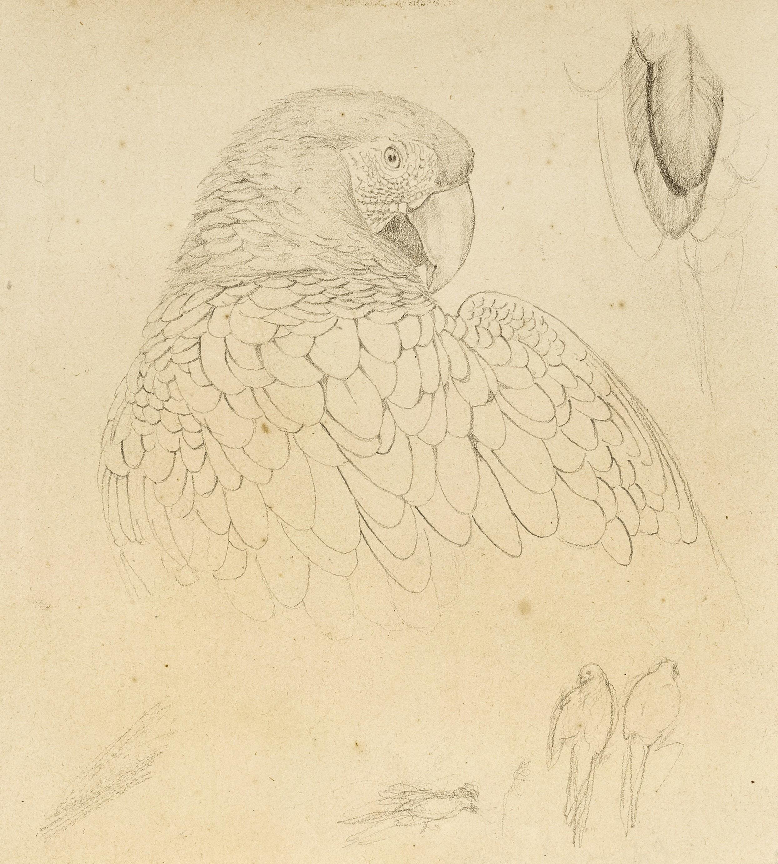 When offered at Sotheby’s, it has been suggested by Vivien Noakes that this study relates to the group of working drawings for Illustrations of the Family of Psittacidae (Department of Printing and Graphic Arts, The Houghton Library, Harvard University). This drawing, which shows Lear concentrating particularly on the feathers, would have been executed in the Zoological Society of London between 1830 and 1832.