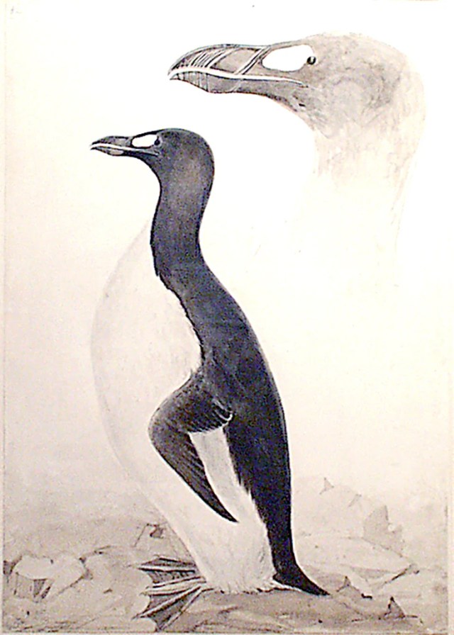 A preliminary pencil drawing of Lear’s “Great Auk” is in the collection of the Blacker-Wood Library, McGill University. This preliminary drawing is not signed; the present watercolor wash drawing based on the McGill sketch is signed by Lear and inscribed by Selby, who executed and signed the etched plate. The etching enlarges the primary figure while eliminating completely the detail of the head in the upper right corner of the watercolor.