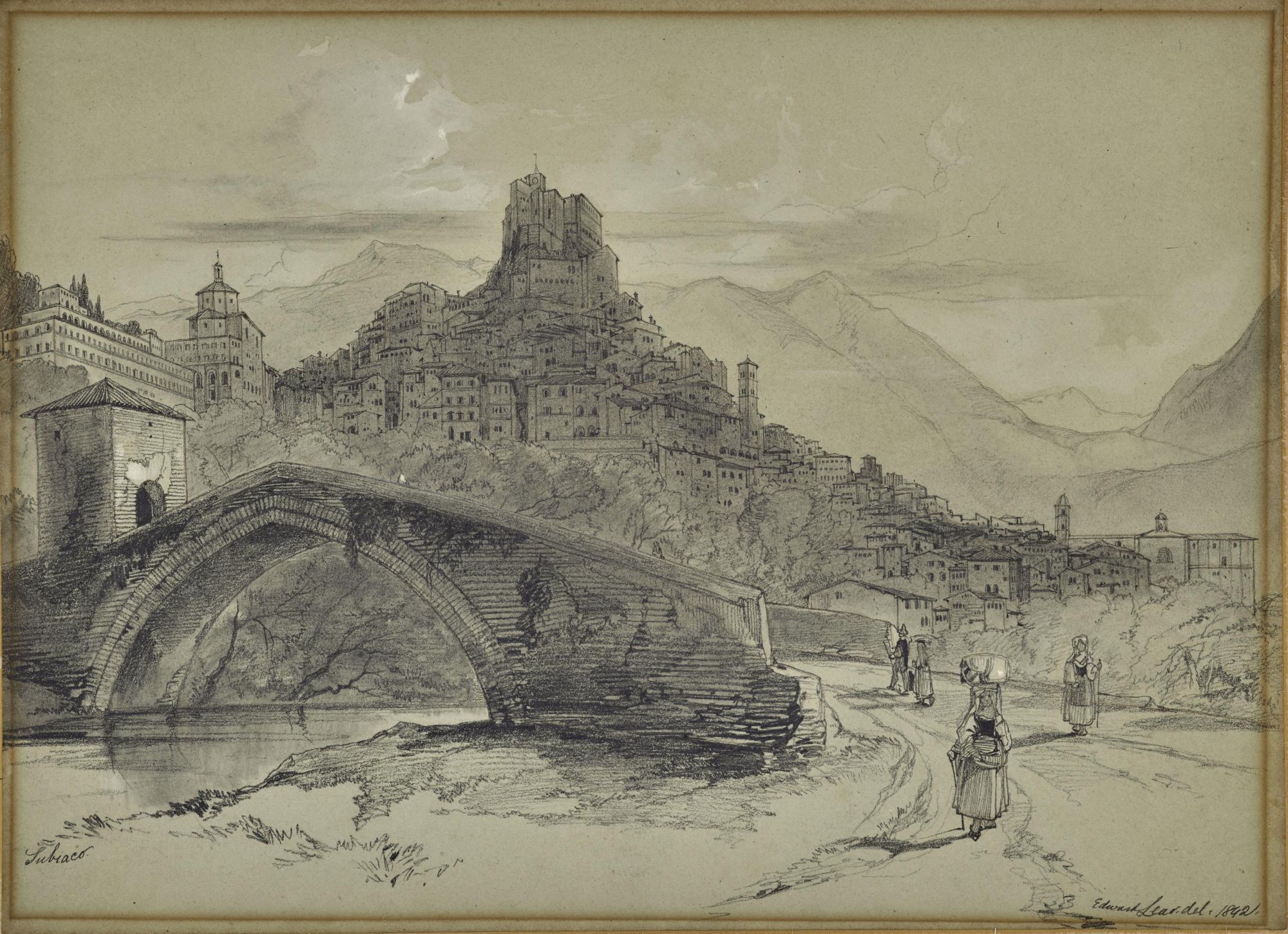 Signed and dated lower right: Edward Lear. del. 1842 and inscribed lower left: Subiaco. Pencil on blue paper, heightened with white. 25.4 by 35 cm., 10 by 13 ¾ in.