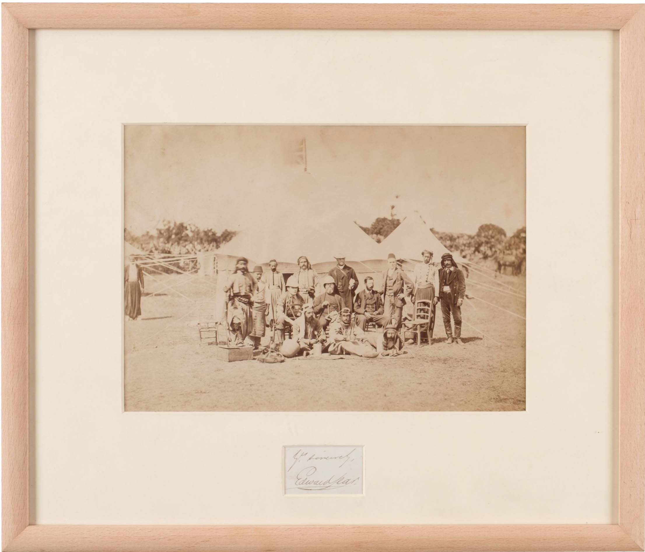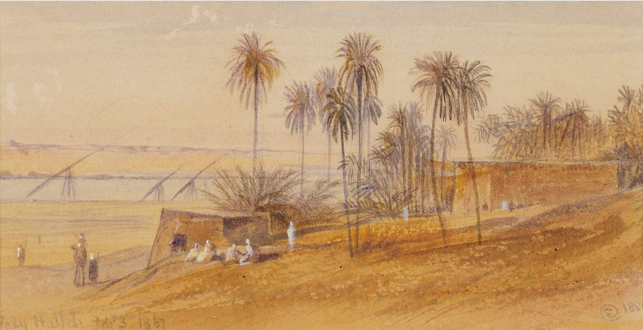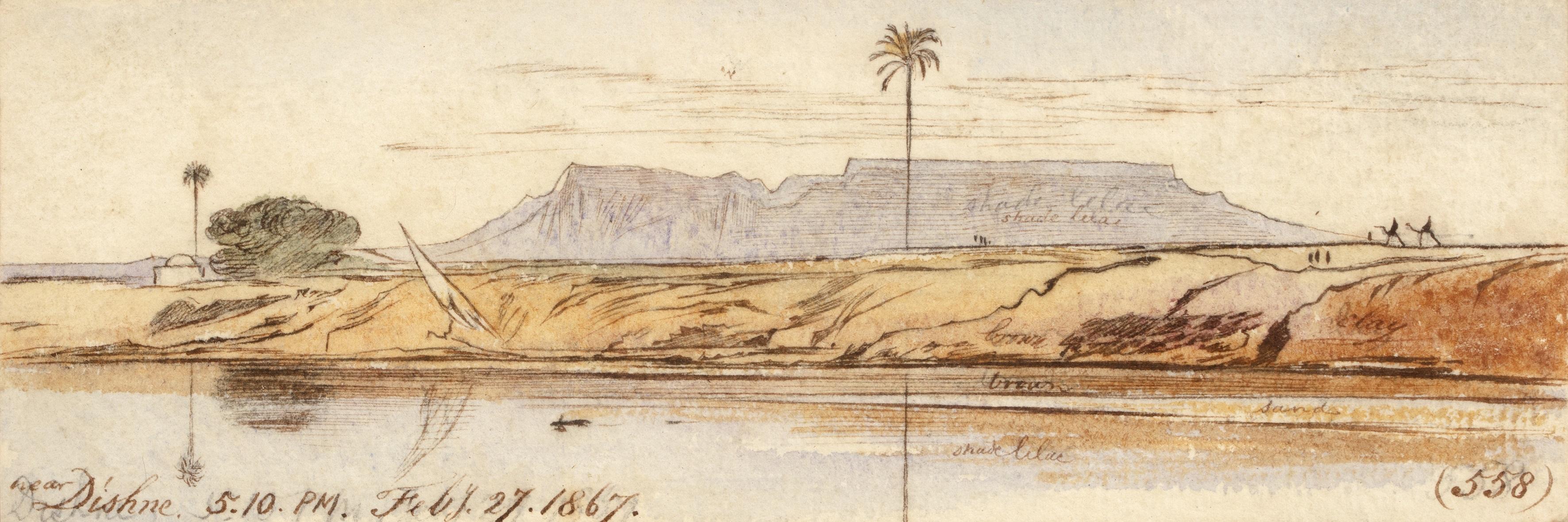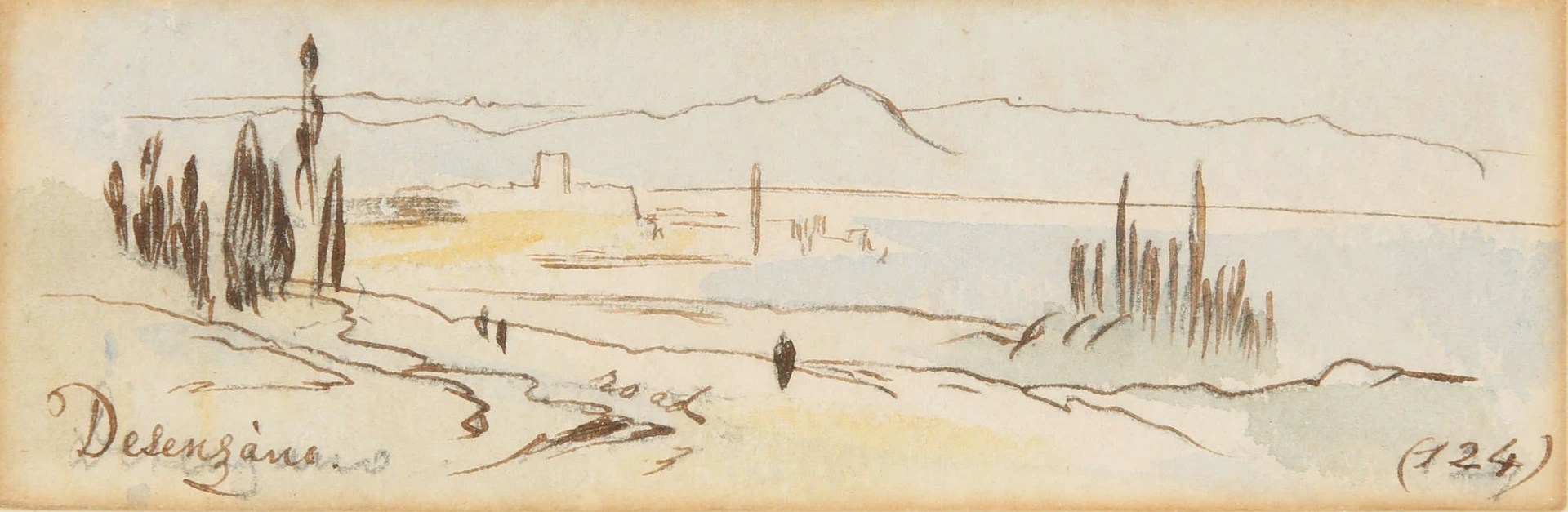 Alfred Tennyson and Edward Lear were both good friends and frequently exchanged letters and verse. In 1862 Lear wrote: ‘I have been looking carefully over all Alfred Tennyson’s poems, & noting out all the Landscape subjects once more-which in all amount to 250. Sometimes I think I shall make the last effort of my life to illustrate the whole of these by degrees, & finally, having constructed a gallery near London -receive shillings for the sight of my pictures, & expire myself gradually in the middle of my own works-wheeling or being wheeled in a armchair.’ Lear produced 200 small wash drawings in the winter of 1884-85 which he mounted on large cards each with eight drawings inscribed with quotes by Tennyson underneath. Lear named this group of drawings – which includes the present and the two following works – his ‘Eggs’ and they were all kept at the Tennyson Research Centre, Lincoln, before being cut up and dispersed in 1980. Another, slightly larger set of 200 drawings (the ‘Chrysalisses’ set) is at the Houghton Library, Harvard University.Literature:Ruth Pitman, Edward Lear’s Tennyson, Manchester, 1988, pp.92-93, illustrated.