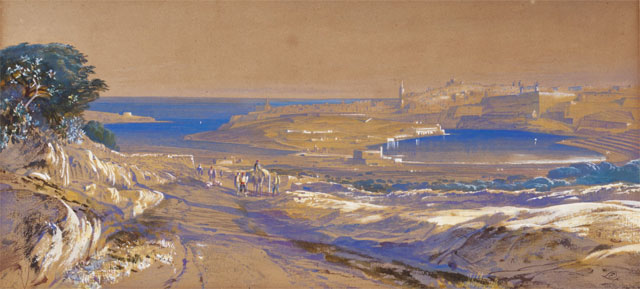 Lear went to Italy in the summer of 1837. For most of the next ten years the artist wintered in Rome and toured other parts of Italy during the summer. He spent the winter months in and around Rome making frequent visits to the Campagna. He wrote in a letter to his sister Ann that Val Montone was: one of the most elegant campagna towns and very curious: it is in a deep dell in the Latin valley- but rises on a mound- crowned with a superb church and castle-though the town itself is wretchedly poor…Fine trees are all around Val Montone- and it is altogether a delightfully quiet place (recorded in the 1930s typescript of the lost manuscript of Lear’s letters to Ann, 11 October 1838).